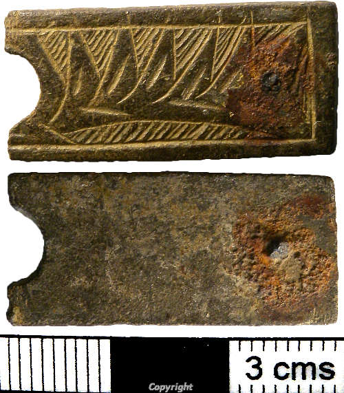?Roman/Early Saxon buckle-plate, 2 fields with dot-and-circle in each. Double stamped borders.