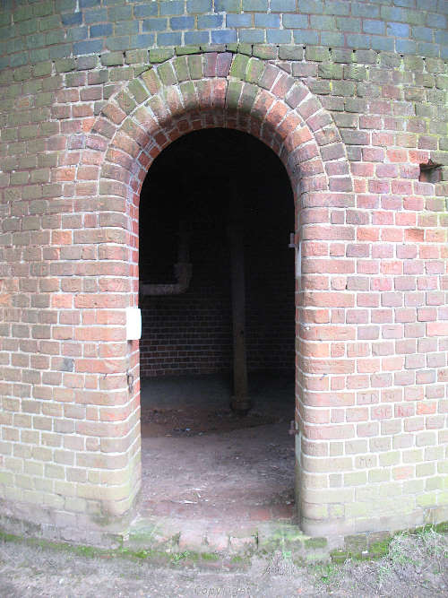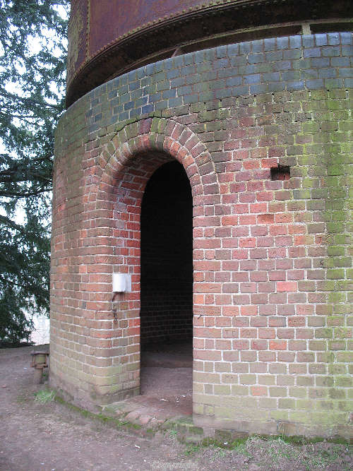 The water tower is a brick circle about 2.5m high of red bricks laid in headers, two courses of blue brick at the top. The metal cylinder of the tank projects downwards inside, like a sausage boiler on end. There is some sort of wooden tripod structure on top.